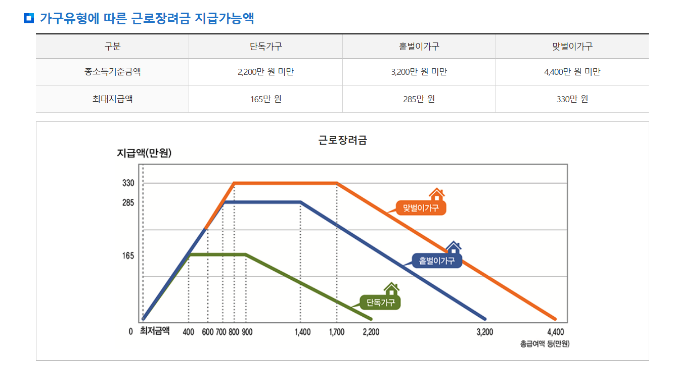 일은 하지만 소득이 적어 생활이 어려운 근로자, 사업자(전문직 제외) 가구에 대하여 가구원 구성과 근로소득, 사업소득 또는 종교인소득에 따라 산정된 근로장려금을 지급함으로써 근로를 장려하고 실질소득을 지원하는 근로연계형 소득지원 제도입니다.
