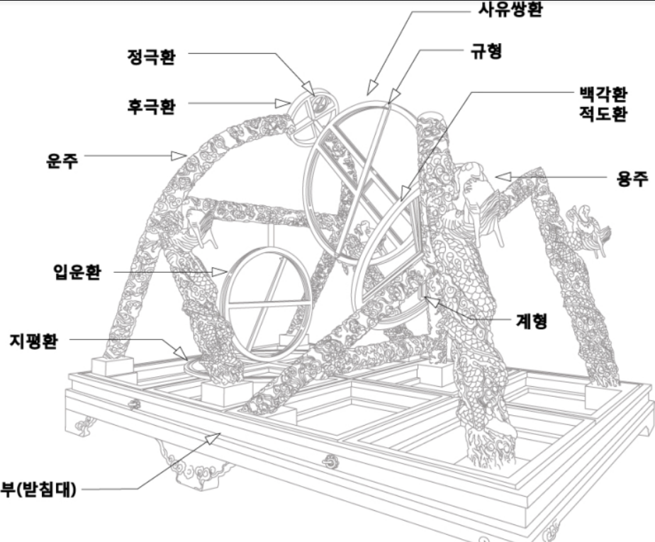 강의는 적도 좌표계와 지평 좌표계 모두를 측정하도록 만들어졌다. 적도 좌표계 부분은 사유쌍환과 규형, 적도환, 백각환, 계형, 정극환과 후극환으로 구성되어 있으며 지방 좌표계 부분은 지평환과 입운환으로 구성되어 있다. 적도 및 지평 좌표를 측정하기 위해서 전체를 들여다보는 관으로 된 규형은 각각 사유환과 입원환에 부착되어 있다. 이들 좌표를 정확하게 측정하려면 먼저 이들 관측기구를 지평, 적도면, 북극, 천정 네 가지 기준점에 정렬시켜야 한다. 적도 좌표를 측정하기 위해서는 먼저 정확한 북극을 찾는 것이 중요하다. 정확한 북극을 맞추기 위한 장치가 정극환과 후극환이다. 후 극환 안의 정극환으로 극축을 조정하면서 사유환이 북극을 향하도록 한다. 사유환은 지구의 자전축을 중심으로 동에서 서로 회전하게 되어 있으며 규형은 남에서 북으로 회전하게 되어있다. 이들을 회전시켜 가면서 규형을 통해 관측하고자 하는 별을 찾아 사유환에 새겨진 눈금을 읽어 북극으로부터의 거리, 즉 거 극도( 천구의 북극으로부터 측정한 별까지의 각도를 의미한다) 를 측정할 수가 있다.
