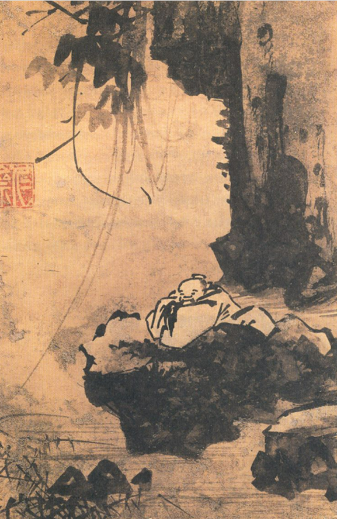 선비가 엎드려 있는 바위는 농묵(먹을 충분히 갈아서 사용하는 진한 먹색)과 중묵(물과 먹의 양이 비슷한 정도의 중간 먹색)의 번짐을 적절히 사용해 거친 돌의 질감뿐 아니라 자연의 포근함을 느끼게 한다. 보는 사람의 시선을 빨아들이는 선비의 자태와 흰 의복은 진한 먹으로 그려 거친 바위 덩어리와 흑백대비를 이루는데, 이를 통해 당대 사대부 화가들의 필력과 세련된 화법을 짐작할 수 있다. 오른편 뒤쪽으로 우뚝 솟아오른 절벽의 옆선과 아랫부분에 있는 진한 먹색의 강렬한 바위선은 이들이 오랜 세월을 그곳에 있었음을 보여준다. 왼편의 여백과 공간 구성은 보는 이가 인물에 집중할 수 있도록 한다. 농묵, 중묵, 담묵(먹보다 물의 양이 많은 흐린 먹색)의 조화로움은 몇 안 되는 잎사귀와 가늘고 날렵하게 늘어진 가지, 작은 바위틈에서 자라난 풀을 살아 숨 쉬게 한다. 그리고 그 틈으로 흐르는 맑은 계곡물은 빠른 붓놀림으로 그려 경쾌함까지 더한다. 이런 먹선의 여유로움에서 문인들과 함께한 수묵화의 발전을 엿볼 수 있다.