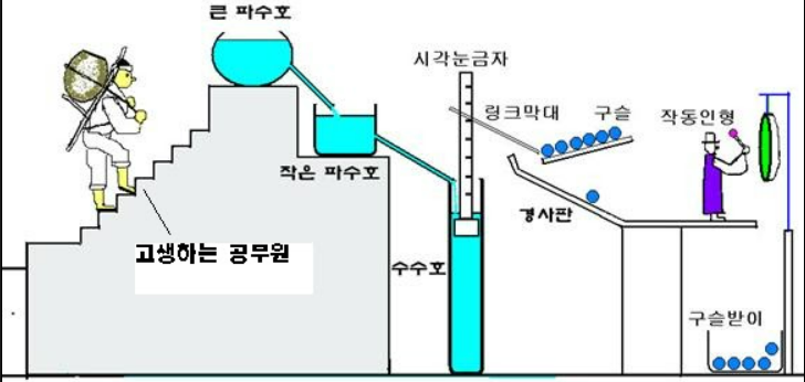 자격루는 중국의 누각법(漏刻法)과 수시력(授時曆) 등을 참고하여 조선의 실정에 맞게 고안되었다. 물의 흐름과 여러 기계적 장치를 이용하여 시간을 자동으로 측정하고 알리는 장치인데 그 원리를 보면 다음과 같은데 그림을 보면 더 쉽게 이해가 가능해 첨부하겠습니다.