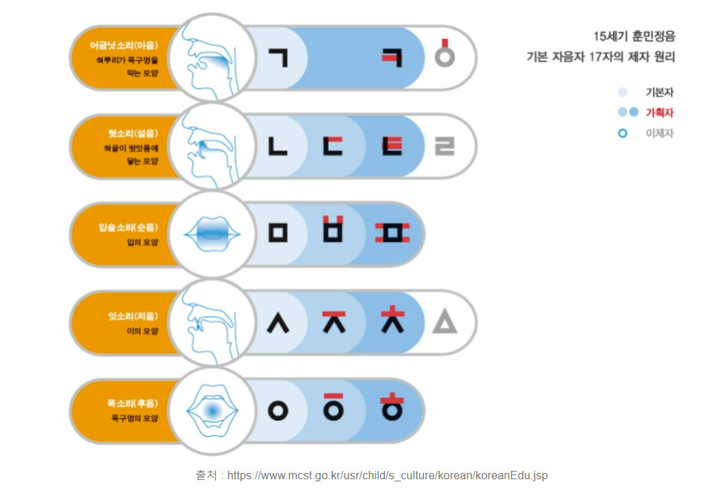 이처럼 기본 글자는 발음 기관의 모습을 성형하여 문자 자체가 소리의 특성을 나타내는 역할을 하고 있다.